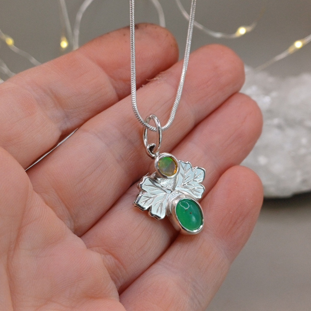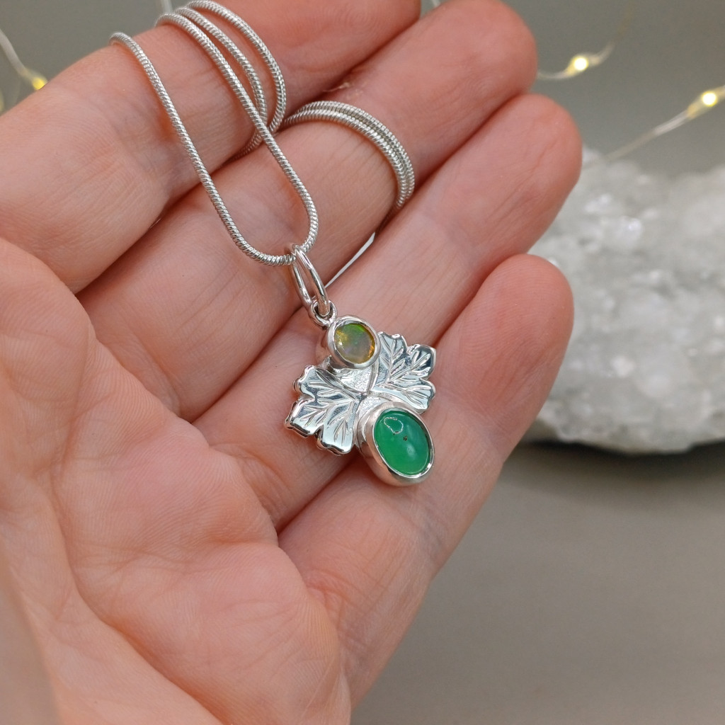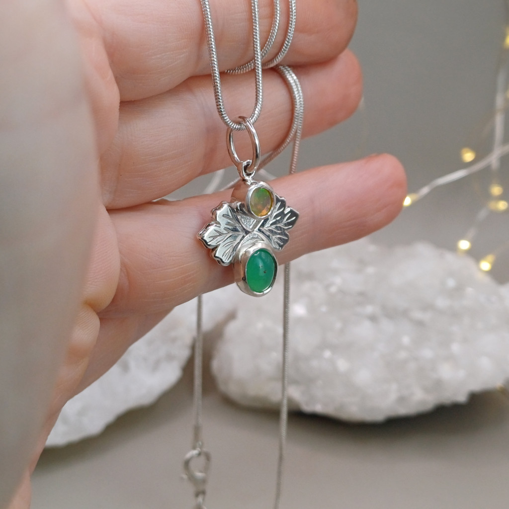 Egyedi, aprólékosan kézzel vésett levél motívum öleli körül a két csodálatos ásványt: a friss, zöld krizoprázt és az ezerszínűen ragyogó, misztikus etióp opált.