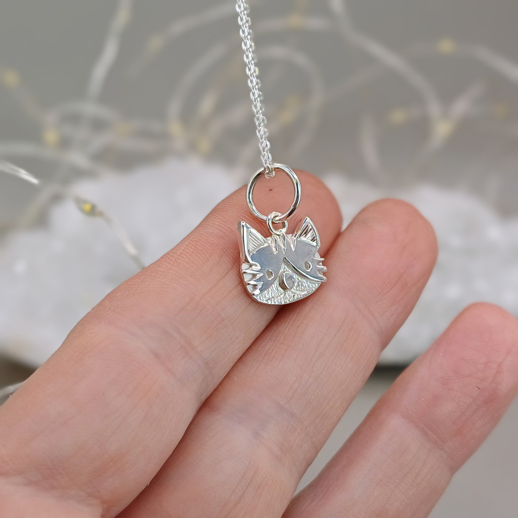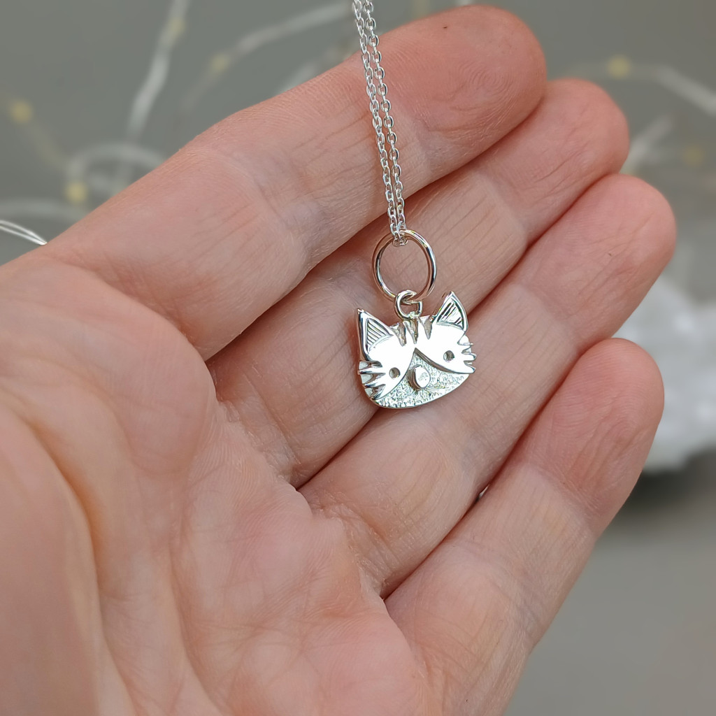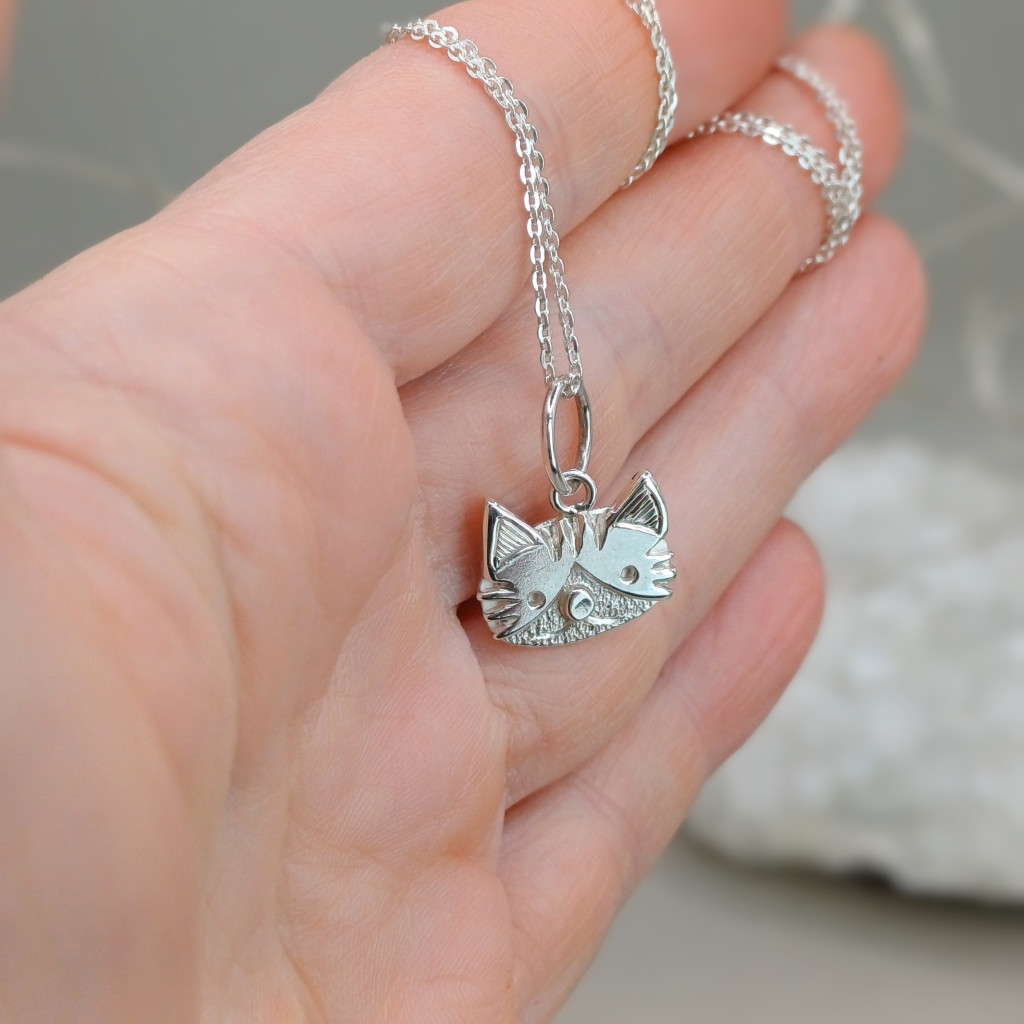 Aki egy cicával osztja meg az életét, pontosan tudja, hogy ők nem csupán háziállatok, hanem hűséges társak. Ezt az ékszert azért alkottam meg, hogy a kedvenced iránti szeretetedet minden nap a szíved felett viselhesd. A sterling ezüst csillogása és a cica bája garantáltan apró mosolyt csal az arcodra minden alkalommal, amikor a tükörbe nézel.