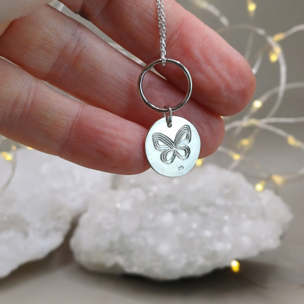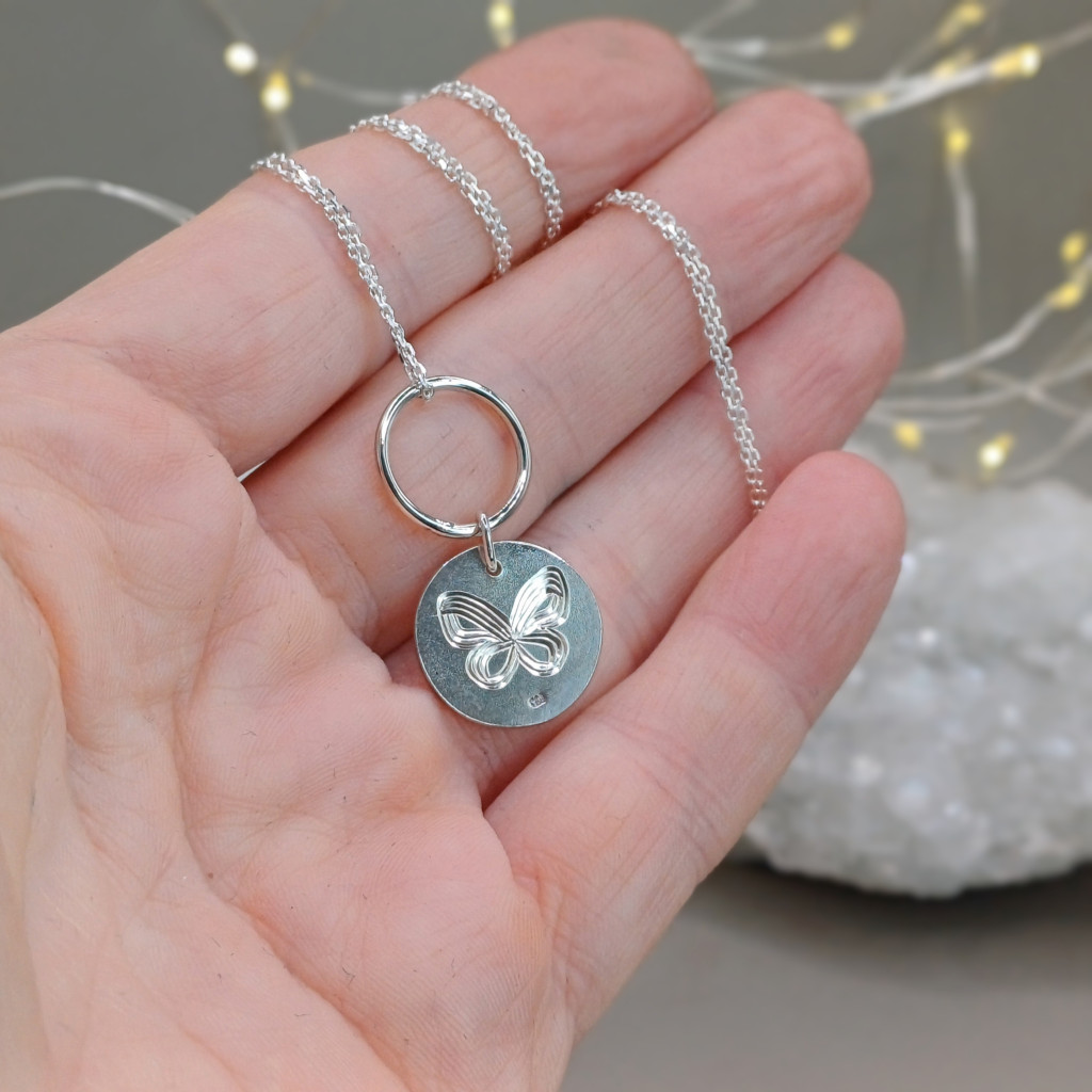 Minden egyes mozdulat, amit a sterling ezüstbe vések, aprólékos és megismételhetetlen. Ez a medál folyamatos mozgásban van, pont úgy, ahogy te: egyik oldalán a megújulást jelképező, légiességet adó pillangó, a másikon egy művészi monogram.
