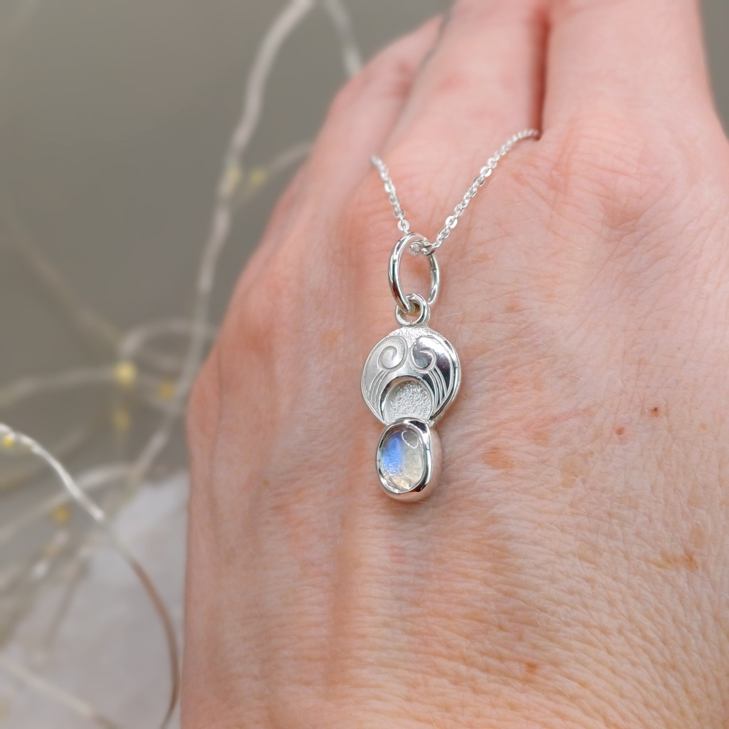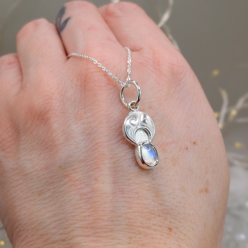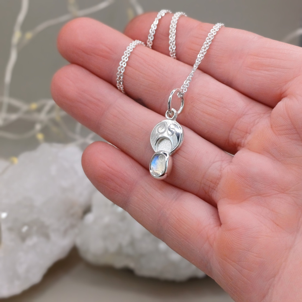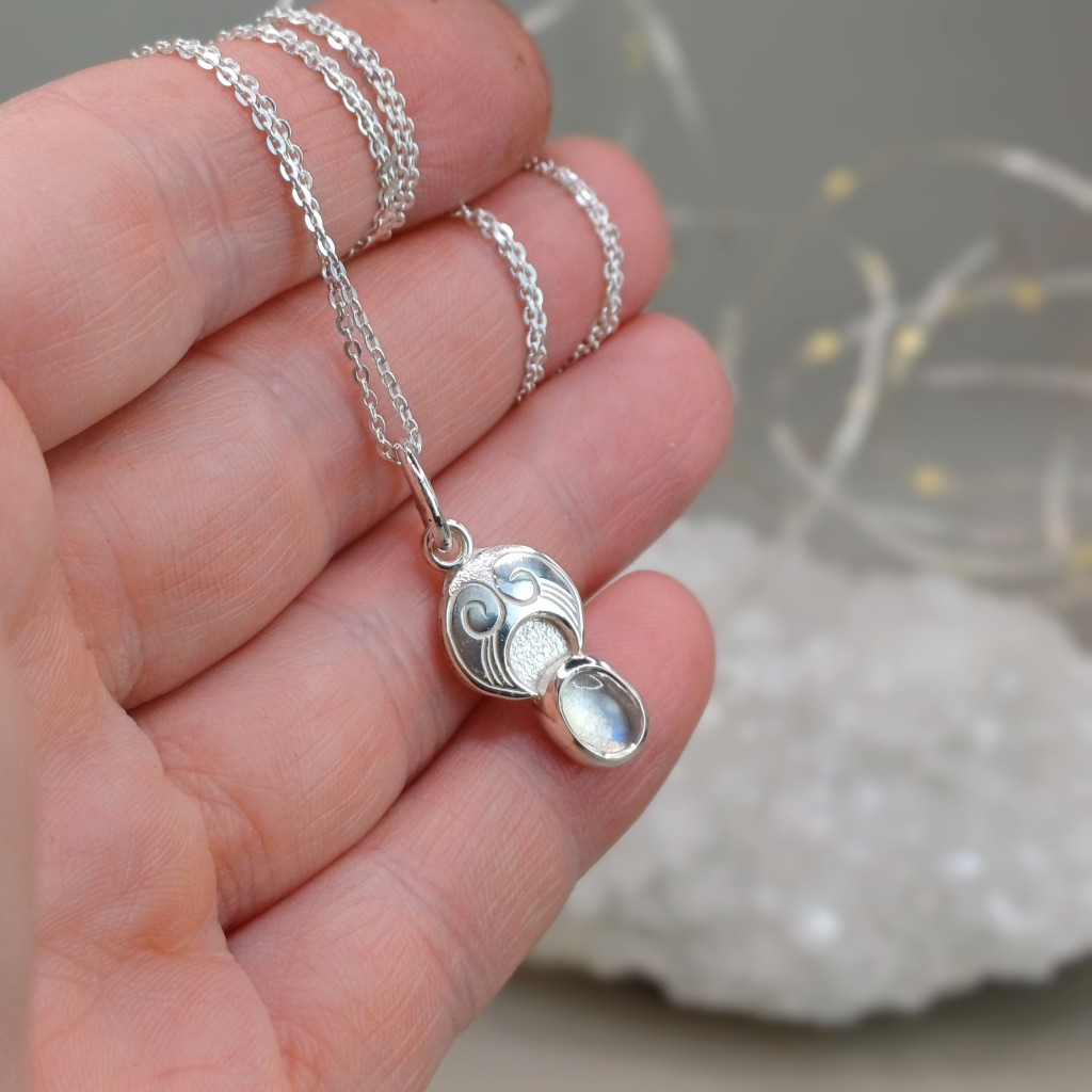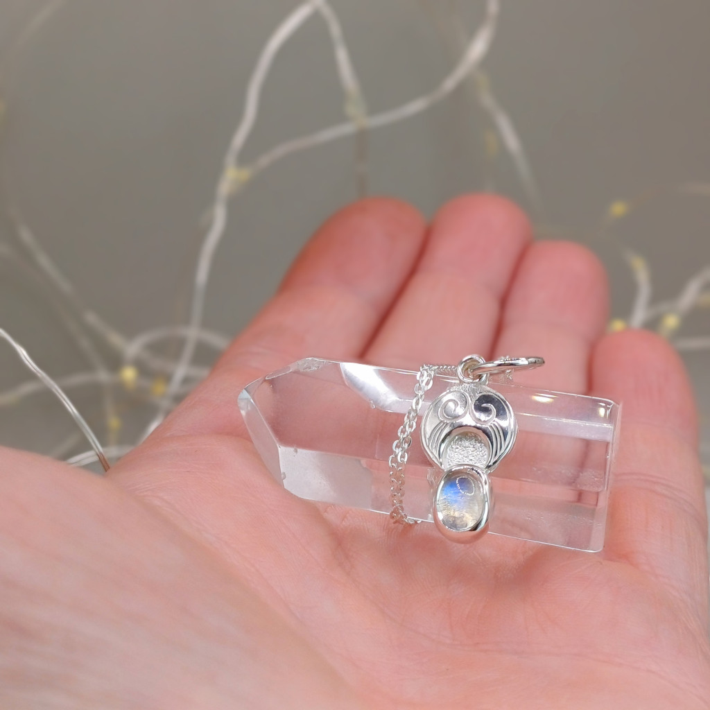 A folyamat a kőfoglalással és a tükörfényesre való polírozással vált teljessé, így a víztiszta szivárványholdkő – a holdfény földi mása – méltó keretet kapott. Ez az amulett emlékeztetőül szolgál viselőjének, hogy a belső fény és a teremtő erő minden élethelyzetben ott ragyog benne.