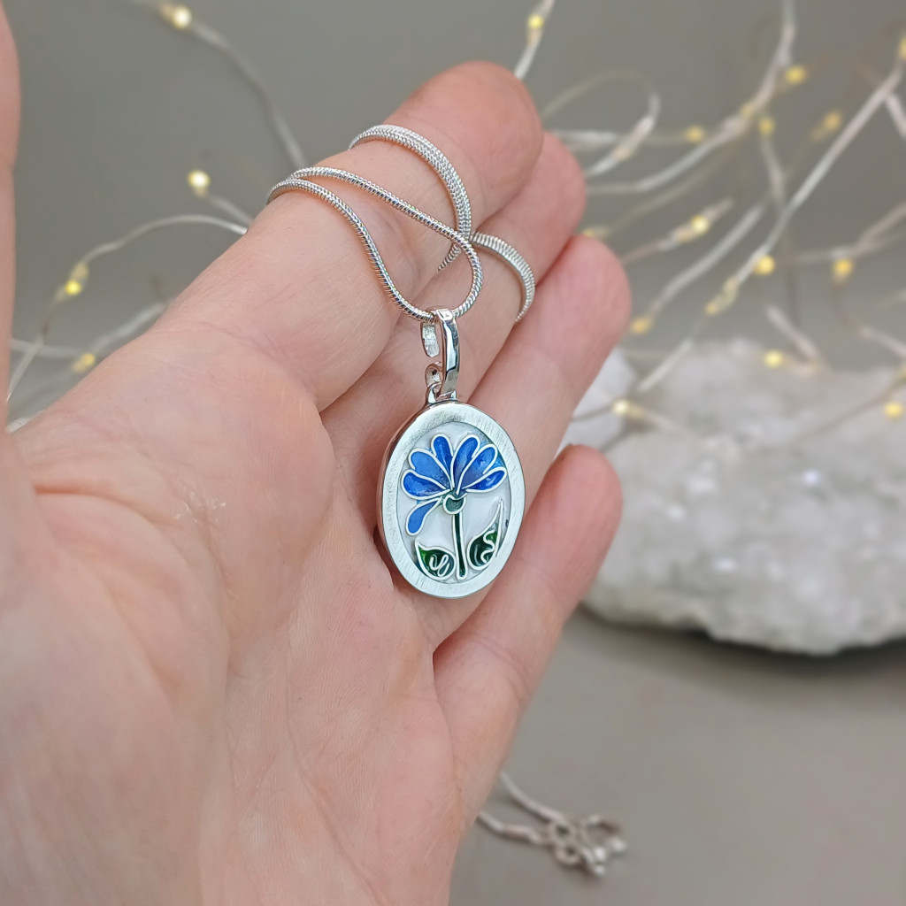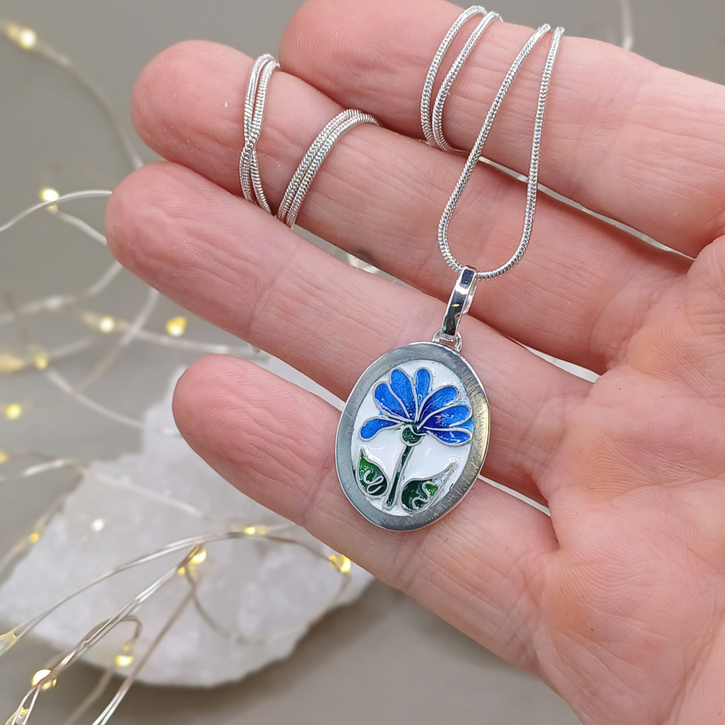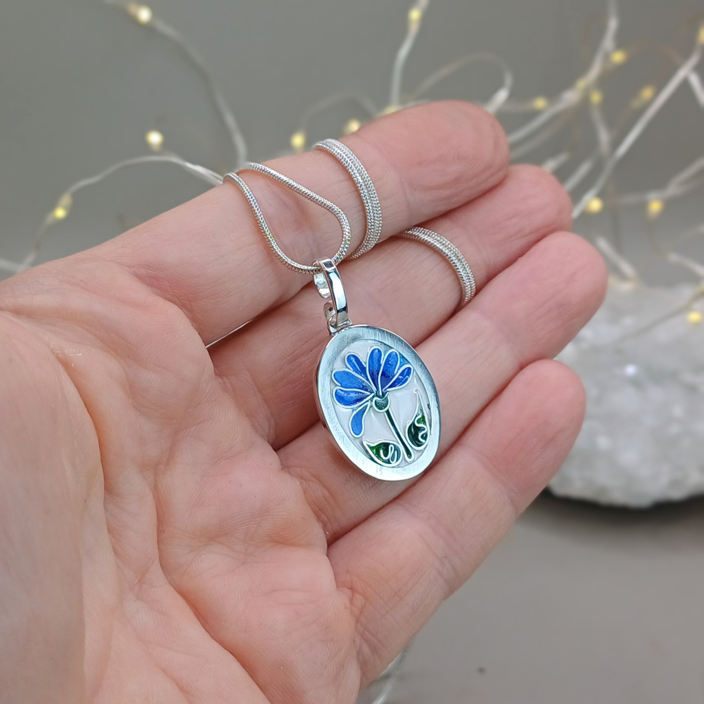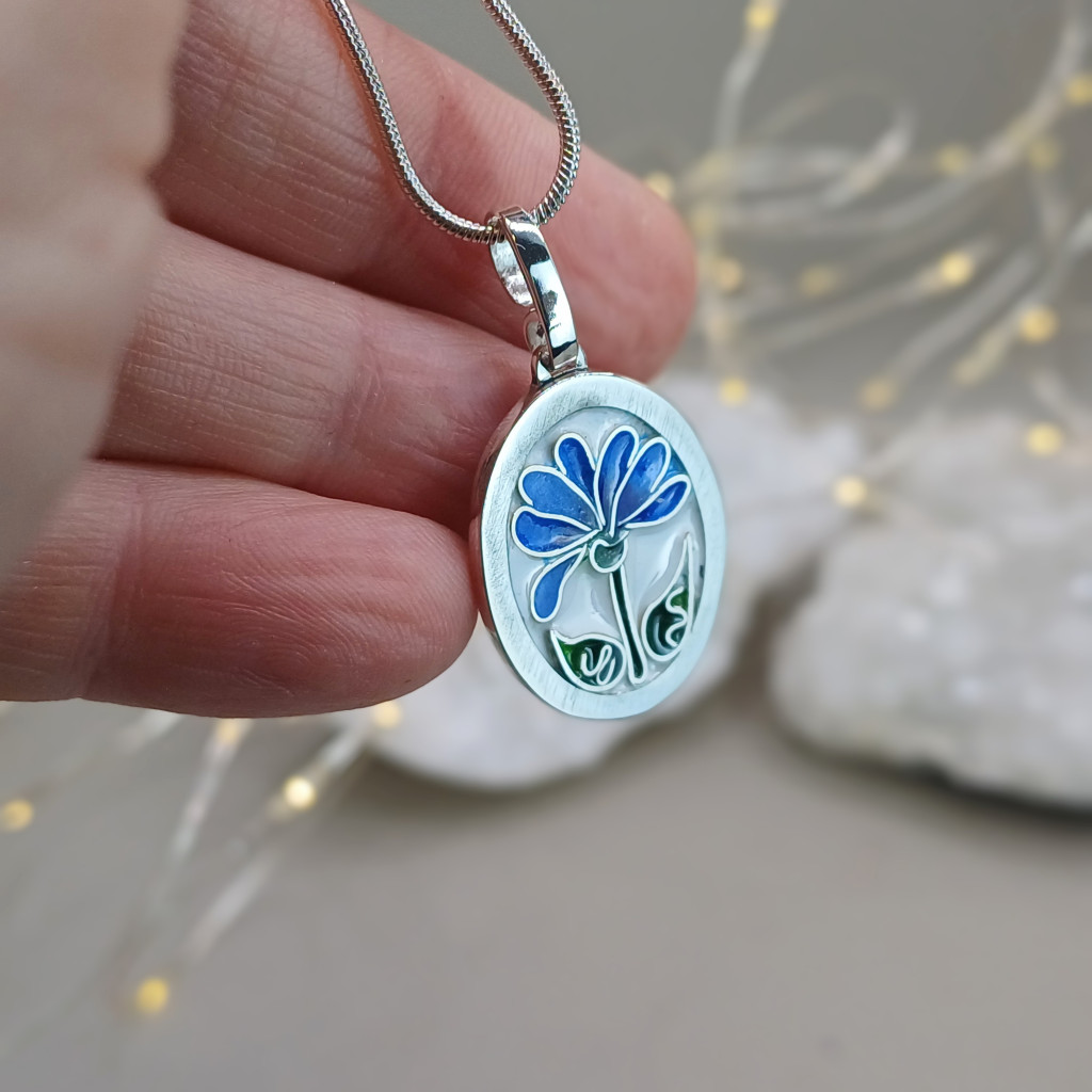 - A kék ezer arca: A rekeszeket apró ecsettel, rétegről rétegre töltöm fel finomra őrölt üvegporral. Ebben a medálban a kék legnemesebb árnyalatait használtam, hogy a virág minden része mélységet és fényt kapjon.